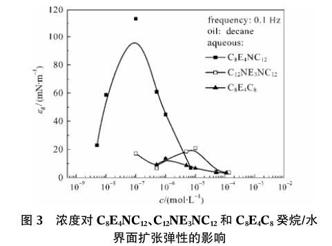 圖3濃度對C8E4NC12、C12NE3NC12和C8E4C8癸烷/水界面擴張彈性的影響