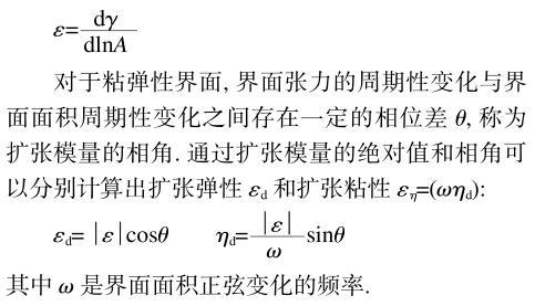 當界面受到周期性壓縮和擴張時,界面張力也隨之發生周期性變化,擴張模量ε定義為界面張力(γ)變化相對于相對界面面積(A)變化的比值。即