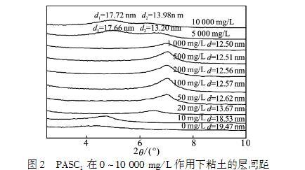 (2)PASC1的插層改變了粘土的層間距,當(dāng)濃度達(dá)到1000mg/L時(shí),層間距d達(dá)到最小。