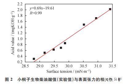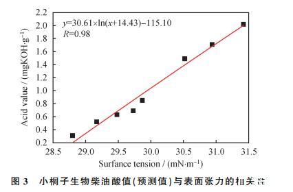 由圖2可知,擬合后得到的方程為y=0.69x-19.61,相關系數R=0.99,說明表面張力與酸值的相關度比較高。綜合圖1、圖2可知,氧化時間、表面張力、酸值三者之間的相關性較高,因此表面張力可作為評估生物柴油降解階段的參數,可用于預測其酸值。