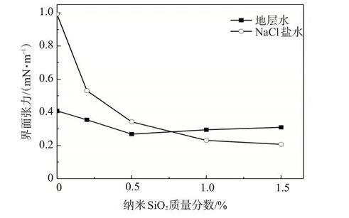 在NaCl鹽水中,納米SiO2/SDS體系的|ζ|基本大于30 mV,體系更易穩定;模擬地層水中二價陽離子的存在使得體系的|ζ|均小于30 mV,顆粒容易聚集沉淀。納米SiO2含量越大,顆粒之間碰撞的機率增加,納米SiO2/SDS體系的穩定性越差。隨著納米SiO2含量的增加,SDS降低油水界面張力的能力在NaCl鹽水中逐漸增強,而在模擬地層水中先增后減,在SiO2質量分數為0.5%時界面張力達到最低。