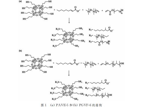 在已經加入25mL二氯甲烷溶劑的50mL圓底燒瓶中加入定量組分的APEG400、VDMS和FEMA,進行混合溶解,最后加入1%(質量分數)的光引發(fā)劑溶解完全后進行封口處理,于溫度為30℃、攪拌速度為300r/min的條件下,放置于紫外燈(20W)照射45min,反應結束后,旋蒸除去溶劑,最終得到無色透明、流動性明顯且富有粘稠狀態(tài)的液體產物POSS-APEG4001-VDMS2-FEMA5,簡稱為PAVE-5。同樣的方法改變其中之一的單體為APEG750,合成得到POSS-APEG7501-VDMS1-FEMA,簡稱PGVF-6。
