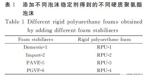 根據傳統(tǒng)制備工藝制備硬質聚氨酯泡沫,分別把添加國產-1、進口-2、PAVE-5和PGVF-6泡沫穩(wěn)定劑得到的硬質聚氨酯泡沫命名為RPU-1、RPU-2、RPU-3、RPU-4。