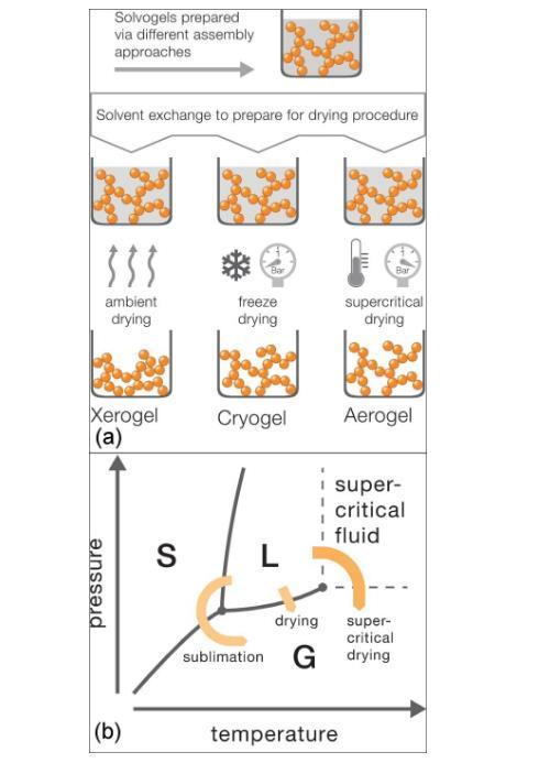 將濕凝膠中的液體轉(zhuǎn)變?yōu)闅怏w,同時(shí)維持骨架結(jié)構(gòu)和體積不變(或較少變化),是氣凝膠制備的另一個(gè)核心步驟。如圖5(a)所示,常用的干燥方法有三種:(1)常壓干燥(ambient pressure drying,簡(jiǎn)稱(chēng)APD),得到體積收縮巨大、高密度、孔洞極少的干膠(xerogel)。(2)冷凍干燥(freeze drying),得到體積較少收縮的凍干膠(cryogel)。(3)超臨界流體干燥(supercritical liquid drying,簡(jiǎn)稱(chēng)SCLD),得到體積和結(jié)構(gòu)都較少變化的氣凝膠。
