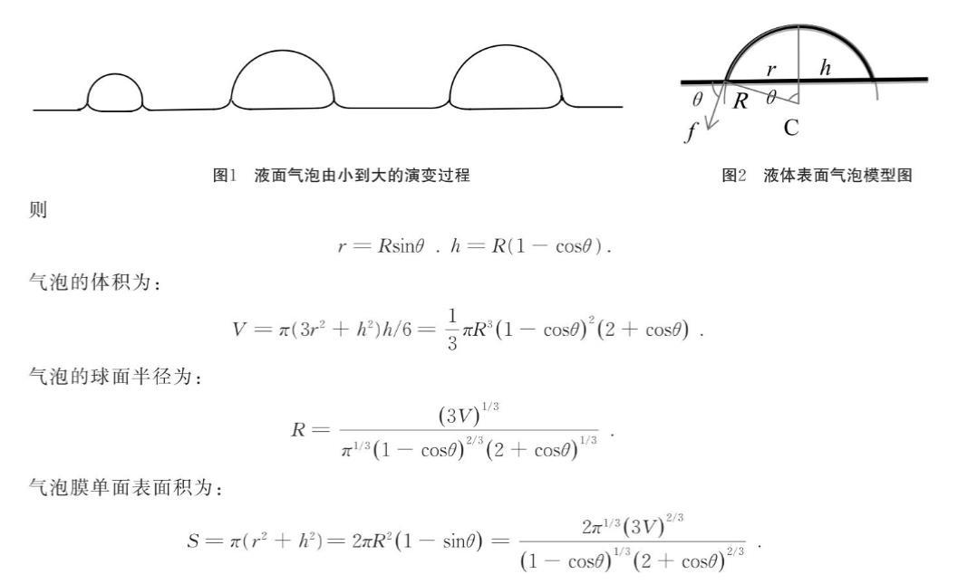 (1)假設液體表面的氣泡足夠大,可忽略氣泡內外因液體表面張力作用引起的液面上彎現象,氣泡內外液體表面均呈水平狀態;(2)假設氣泡內氣體為恒溫恒壓恒容的理想氣體,且忽略內外壓強差引起的氣泡內液面凹陷,即氣泡內與氣泡外液體表面處于同一水平面上;(3)由于氣泡膜壁很薄很輕,在此忽略重力對氣泡膜形狀的影響,并假設氣泡內、外表面積近似相等,(4)假設該液體表面各向同性,所以表面形成的穩定氣泡邊界為圓形.