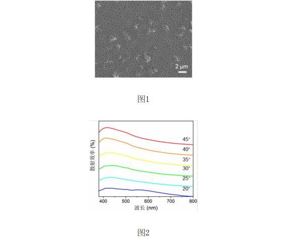 一種具有結(jié)構(gòu)色的材料,主要由透明的基底和均勻覆蓋在基底表面的單層的納米環(huán)陣列組成;在納米環(huán)陣列中,納米環(huán)以“平躺”的方式緊密排列,每平方毫米排列納米環(huán)的個(gè)數(shù)為800-2000個(gè)。該結(jié)構(gòu)色材料在透射條件下能夠呈現(xiàn)出隨著觀察角度變化的結(jié)構(gòu)色。