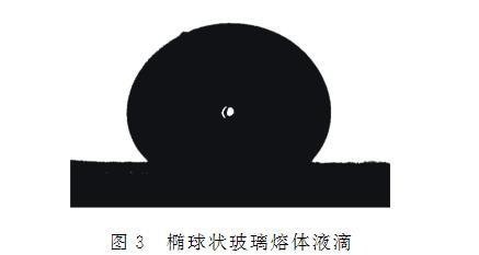 將制備的玻璃樣塊用錫紙包裹,用鐵錘捶碎后用鉗子修整成較方正的顆粒,選取內(nèi)部無氣泡結(jié)石且質(zhì)量為0.15~0.30g的碎塊用于測試。測試前選用T4溫度表面張力為334 mN/m的標準鈉鈣玻璃校準表面張力測量儀。測試的具體操作步驟如下:將表面張力測量儀加熱爐升溫至測量溫度,通入高純氮氣作為保護氣體,然后將制備好的玻璃樣品置于石墨片上,送入加熱爐中的樣品臺上進行保溫,試樣在表面張力作用下收縮成橢球狀液滴,如圖3所示,將液滴置于拍攝裝置視野中心,保溫30 min至熔體穩(wěn)定。隨后,用圖像采集裝置獲取橢球熔體的外輪廓線,通過軟件數(shù)值分析得到輪廓參數(shù),利用Young-Laplace方程進行解析,計算出樣品的表面張力(σ),反復測試若干次后取σ的平均值為樣品在該測試條件下的表面張力值。