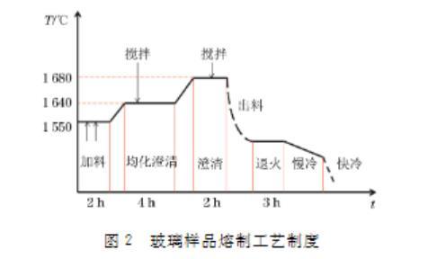 實驗樣品的熔制流程如圖2所示,首先根據(jù)組分設(shè)計計算玻璃配方,稱量并配制約500g配合料,在研缽內(nèi)充分研磨、混合均勻,待硅鉬棒電爐升溫至1550 ℃時,將混合均勻的配合料分多次加入預熱過的鉑金坩堝中,保溫2h至原料熔化充分后以5 ℃/min的升溫速率加熱至1640 ℃,并在該溫度條件下保溫4h,實現(xiàn)玻璃的充分熔化與澄清。然后繼續(xù)升溫至1680 ℃保溫2h使玻璃液完全澄清,出料前30 min進行攪拌,然后將玻璃液澆筑在預熱的耐熱鋼模內(nèi),成型后轉(zhuǎn)入780 ℃的馬弗爐內(nèi)進行退火處理,保溫3h后再以1 ℃/min降溫速率慢冷至300 ℃,隨爐冷卻得到經(jīng)過退火的玻璃樣塊。