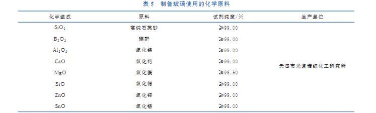 實驗所用的玻璃原料包括石英砂、氧化鋁、硼酐(氧化硼)、氧化鈣、氧化鎂、氧化鍶、氧化鋅,化學澄清劑所用原料為氧化亞錫,試劑純度等級均為分析純(AR),實驗設(shè)計引入成分及使用的原料種類、具體純度如表5所示,所有化學成分均以氧化物原料的形式引入,玻璃成分中除原料可能含有的部分雜質(zhì)以外,均不含任何人為引入的其他成分。