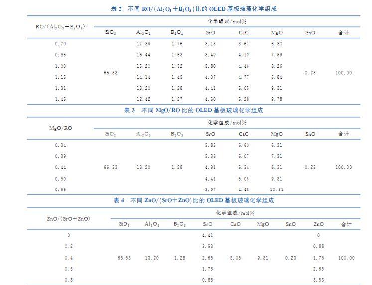 根據(jù)開發(fā)需求,本文設(shè)計了四組不同化學組成的OLED基板玻璃。如表1~表4所示,分別通過改變組成中的Al?O?/SiO?、RO/(Al?O?+B?O?)、MgO/RO和ZnO/(SrO+ZnO),研究表面惰性組分和表面活性組分的相對含量,以及同堿土金屬氧化物網(wǎng)絡(luò)作用相似但活性更強的過渡金屬氧化物對無堿鋁硅酸鹽玻璃表面張力的影響。