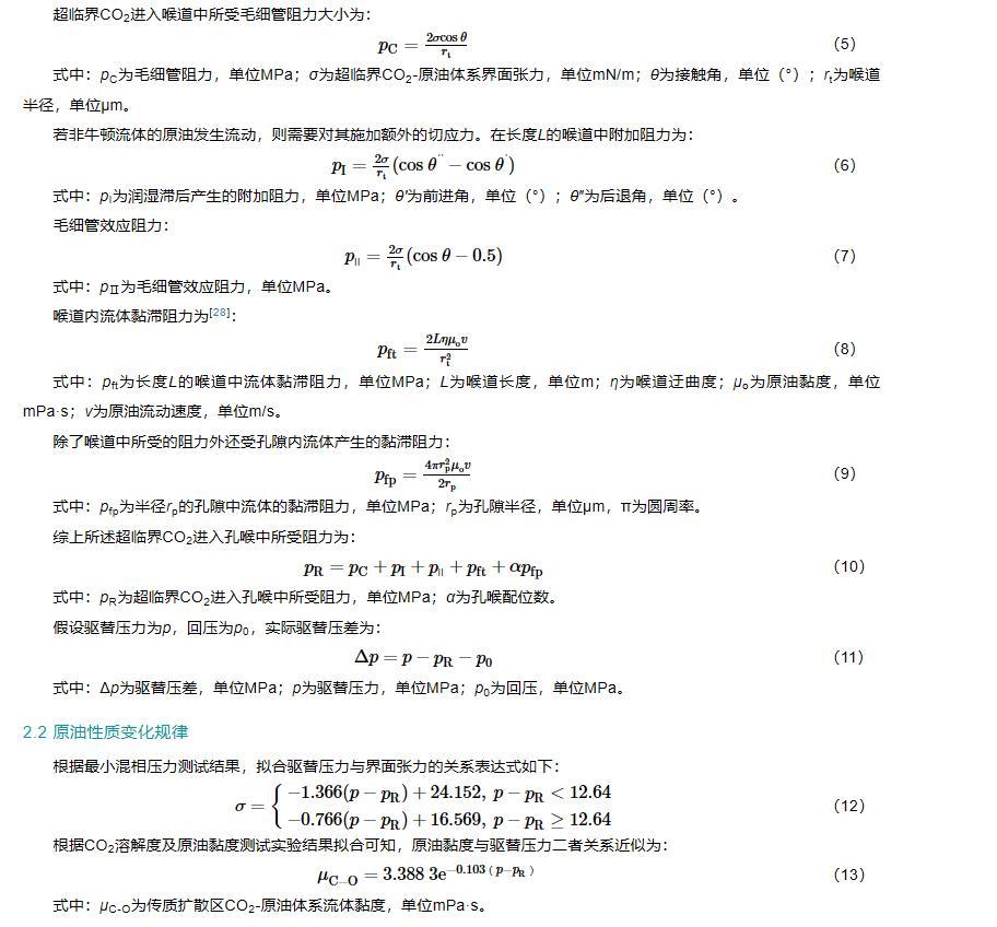 CO2進(jìn)入孔喉時(shí)與原油的接觸時(shí)間較短,來不及進(jìn)行擴(kuò)散、溶解,此時(shí)原油和CO2的物理性質(zhì)尚未發(fā)生變化。超臨界CO2進(jìn)入喉道中所受毛細(xì)管阻力是由超臨界CO2-原油界面張力、潤濕接觸角、孔喉半徑等參數(shù)共同引起: