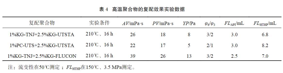 室內以濾失改善效果較好的1%DrilFILHT為基礎,考察增黏劑KG-TNJ、PC-UTS與2種抗超高溫改性淀粉的復配效果,選定材料最佳組合。評價配方:基礎配方+1.0%DrilFILHT+復配聚合物,實驗結果見表4。