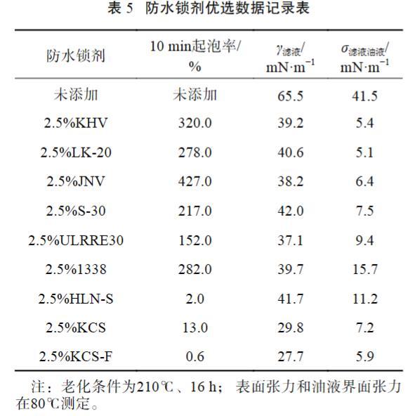 前期鉆井作業期間,鉆開儲層前低滲透鉆開液體系中加入了防水鎖劑材料,發現加入后出現了起泡問題,加入消泡劑后有一定效果但是循環和再加入防水鎖劑時又會出現起泡情況,一定程度上影響了正常作業。另外,由于起泡問題,會將空氣中氧氣攜帶進入鉆井液中,在井底高溫環境中會加速鉆井液中聚合物材料的降解。為了解決起泡問題,同時預防低孔低滲儲層的水鎖傷害,室內開展超高溫低滲透鉆開液體系配套防水鎖劑優選試驗。