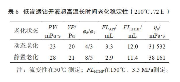 表6低滲透鉆開液超高溫長時間老化穩定性(210℃、72 h)