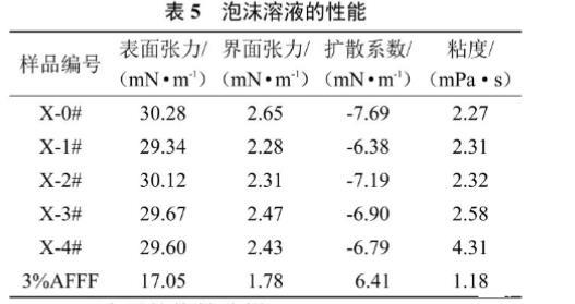 測得環己烷的表面張力為25.24 mN/m,根據式(1),6組試驗組其擴散系數如表5所示。X-0#、X-1#、X-2#、X-3#和X-4#樣品擴散系數都為負值。試劑復配后活性劑分子疏水基水分子之間依然有較大斥力,因此,此配方所產生的泡沫無法在油面上形成水膜[11]。X-0#、X-1#、X-2#、X-3#和X-4#樣品之間的表面張力和界面張力表現出較小的差異,分別在29.60~30.28 mN/m和2.31~2.65 mN/m之間。表明XG對泡沫溶液的表面張力和界面張力影響較小,影響表面張力和界面張力的主要原因是表面活性劑的種類。X-4#樣品的粘度變化比較明顯,因為XG濃度的增加導致聚合物網絡結構的增強,并且XG與表面活性劑相互作用:通過靜電、疏水和氫鍵等發生,這有助于顯著增加溶液粘度的協同效應。