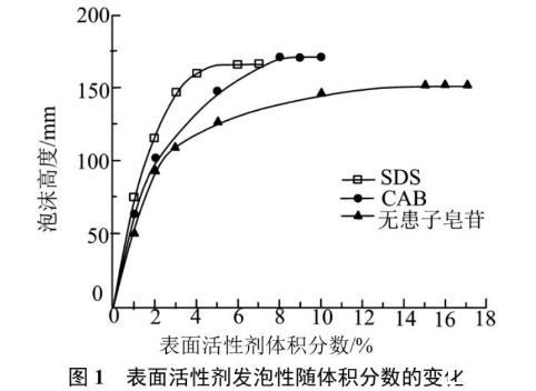 如圖1所示,3種表面活性劑發泡性能隨濃度增加而增大,都經過了快速增長階段、緩慢增長階段,最后發泡高度趨于平穩,不再隨濃度增加而變化。SDS、CAB、無患子皂苷質量分數分別在5%、8%、15%時初始泡沫高度達到了最高值,分別是166 mm、171 mm、152 mm。形成大量泡沫的關鍵因素是表面流動性[8],以上結果表明CAB具有更好的表面流動性。