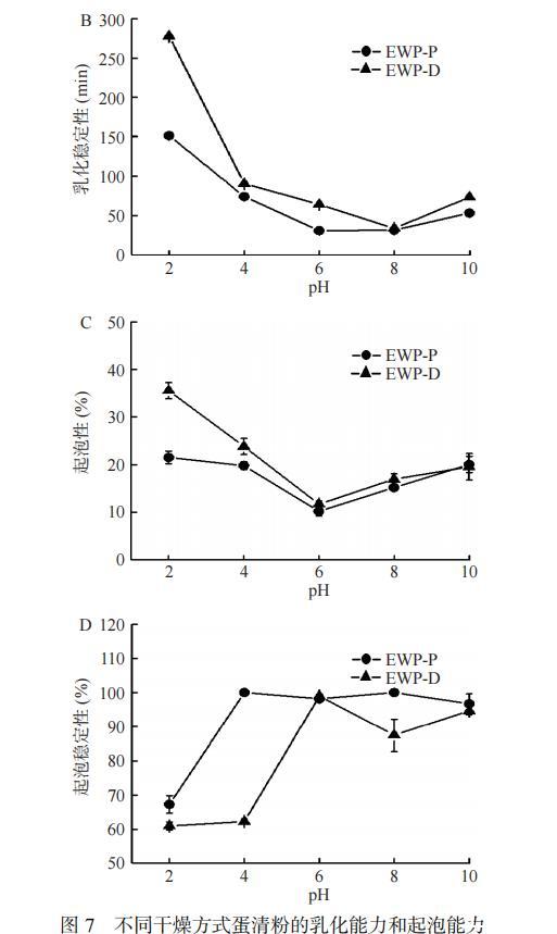 Dabbour等研究向日葵蛋白時也發(fā)現(xiàn)所有的蛋白樣品在pH6.0時的起泡性最低,且冷凍干燥樣品的起泡性優(yōu)于對流烘箱干燥樣品。另一方面,泡沫穩(wěn)定性與蛋白膜的強度有關,蛋白質在攪打時,蛋白質分子被吸附在空氣-水界面,蛋白質分子重新排列,使其疏水部分朝向氣相方向,這種變化容易引起巰基的氧化,在空氣-水界面與相鄰的蛋白質分子中的巰基形成二硫鍵,從而增強界面膜的強度,有利于泡沫穩(wěn)定性。EWP-P的泡沫穩(wěn)定性大于EWP-D,可能是因為噴霧干燥可能導致更多的蛋白質展開,表面游離巰基含量較多。另一方面可能是因為EWP-P發(fā)生了美拉德反應,在空氣-水界面上可以形成的厚的粘彈性美拉德產物層,有利于泡沫穩(wěn)定性的增加。Zeng等研究不同干燥方式對雞皮膠原蛋白多肽時也發(fā)現(xiàn)噴霧干燥使其蛋白樣品的泡沫穩(wěn)定性優(yōu)于冷凍干燥樣品。