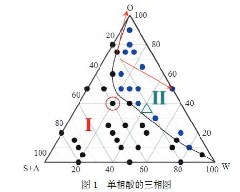 通過擬三元相圖制備單相酸相圖,根據(jù)油相(O)、酸相(W)、表面活性劑(S)+助表面活性劑(A)的比例進行三相圖的繪制。室溫下,固定油相(O)的加量,固定非離子表面活性劑(S1)與陽離子表面活性劑(S2)的質(zhì)量比,固定表面活性劑(S,S=S1+S2)與助表面活性劑(A)的質(zhì)量比。將不同比例下的液體進行離心,然后進行觀測,觀察體系由澄清透明(一相)變?yōu)榛鞚幔ǘ啵┑南嘧冞^程,在每次發(fā)生相變的同時記錄所滴加鹽酸的量,以O(shè)、S+A、W為三相,繪制擬三元相圖,見圖1。由圖1可知,在圖1的紅圈標記區(qū)域,配方的經(jīng)濟性最好,是維持單相區(qū)域最小的表面活性劑用量(S+A),且該配方下的單相酸遇水遇油后仍可在較大范圍內(nèi)保持單相。