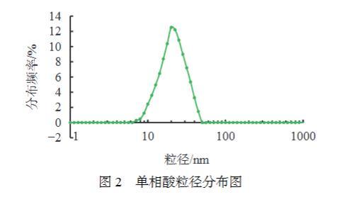 采用激光粒度分析儀對單相酸粒徑及分布進行了測定,實驗結(jié)果見圖2。可知單相酸粒徑大小分布在7~50 nm范圍之內(nèi),分布較窄,為高斯分布,在單相微乳粒徑范圍內(nèi)。