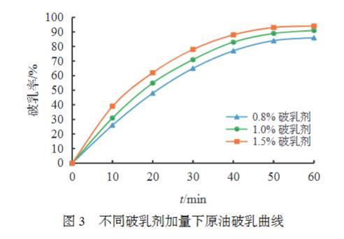 將單相酸與原油高速攪拌混合制備乳狀液,油水比3∶2。分別加入0.8%、1.0%、1.5%二酸二辛脂磺酸鈉破乳劑,水浴90℃,靜態(tài)放置,每隔10 min測量析出量,計算破乳率,實驗結(jié)果見圖3。加入1%破乳劑后,單相酸破乳率在1 h內(nèi)可達到90%以上。