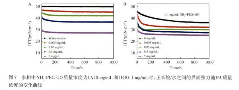 固定NH2-PEG-GO質(zhì)量濃度(0.1 mg/mL),分析改變正辛烷溶液中PA質(zhì)量濃度時界面張力的變化情況。動態(tài)界面張力的演變?nèi)鐖D7所示,當正辛烷中PA質(zhì)量濃度小于5 mg/mL時,即使加入微量的NH2-PEG-GO(0.1 mg/mL)就能夠顯著降低界面張力,相比于不添加NH2-PEG-GO時的情況降低了約15 mN/m。然而,隨著PA質(zhì)量濃度的增加(0.005~5 mg/mL),界面張力僅從32 mN/m降低到25 mN/m(圖7B)。在不添加NH2-PEG-GO時,隨PA質(zhì)量濃度增加(0.005~5 mg/L),界面張力的下降值則約為20 mN/m(圖7A)。這表明NH2-PEG-GO的添加使得PA在界面上吸附減少,NH2-PEG-GO成為降低界面張力的主導因素。然而隨著PA質(zhì)量濃度升高,PA的界面吸附量逐漸達到飽和,少量NH2-PEG-GO的存在不會顯著降低界面張力。當PA的質(zhì)量濃度達到5 mg/mL時,存在0.1 mg/mL NH2-PEG-GO僅比不存在時降低了約2 mN/m,這是由于此時界面被PA占滿,沒有足夠的空間供NH2-PEG-GO進行吸附。