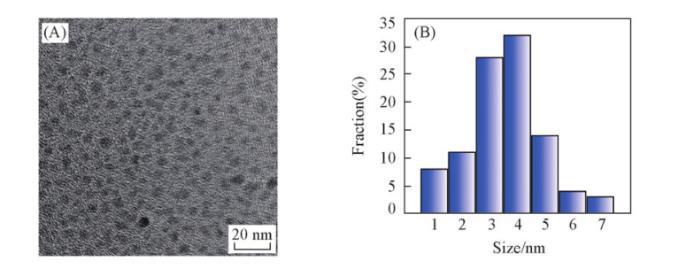 通過傅里葉變換紅外光譜(FTIR)、透射電子顯微鏡(TEM)和X射線衍射(XRD)對(duì)DA-GQD的結(jié)構(gòu)進(jìn)行表征。從FTIR譜圖(圖S1,見本文支持信息)可知,DA-GQD可能包含C—H,O—H,O═C(R)—和C—N基團(tuán)。從TEM和粒徑分布圖(圖2)可以看出,DA-GQD顆粒比較均勻,基本上為橢球形納米顆粒,粒徑主要分布在1~7 nm,平均粒徑約為3.5 nm。XRD譜圖(圖S2,見本文支持信息)中在20°左右有一個(gè)較寬的峰,說明合成的DA-GQD具有石墨烯結(jié)構(gòu)。