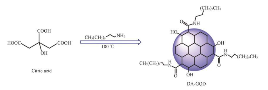 首先采用“自上而下”法,由CX-72炭黑在濃硝酸中回流24 h制備GQD。雖然能夠?qū)崿F(xiàn)一步同時(shí)制備單層和多層GQD,但是存在反應(yīng)時(shí)間長(zhǎng)、強(qiáng)酸會(huì)對(duì)環(huán)境造成一定污染等弊端。本實(shí)驗(yàn)設(shè)計(jì)通過“自下而上”法,以檸檬酸為前驅(qū)體、直鏈烷基胺為功能化試劑,通過一步熱裂解制備雙親性DA-GQD(見圖1)。檸檬酸分子之間脫水縮合形成六邊形sp2碳原子鍵合的石墨烯片,十二胺通過氨基與檸檬酸上的羧基縮合,將烷基鏈引入石墨烯片的邊緣以提高疏水性。