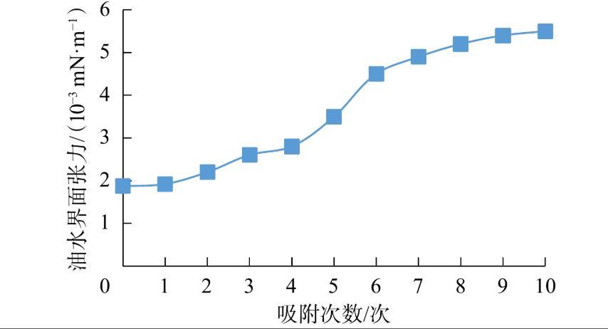 圖4為使用巖心粉對質量分數為0.5%的OBU-3溶液重復進行10次吸附實驗后的油水界面張力情況。從圖4可看出:隨著吸附次數的增加,油水界面張力增加;經過10次吸附后,油水界面張力仍在超低界面張力范圍內。這說明OBU-3低黏表面活性劑體系在巖心上吸附較少,吸附多次后,在油水界面上仍足以使界面張力處于超低值,滿足驅油對表面活性劑的要求。
