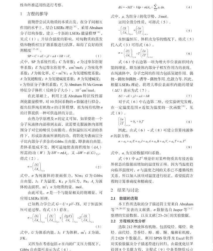 本工作提出一種將σ這一宏觀物性與微觀分子間作用力相關聯(lián)的一種新的計算方法。根據(jù)線性溶劑化能量關系(LSERs)理論和經(jīng)驗方程,提出了在不同溫度下估算純有機物σ的關聯(lián)式。利用所得關聯(lián)式對2 628個純組分體系中的10個同系物進行了回歸,得到了σ的關聯(lián)方程,并對方程的相關性和外推適用性進行考察。