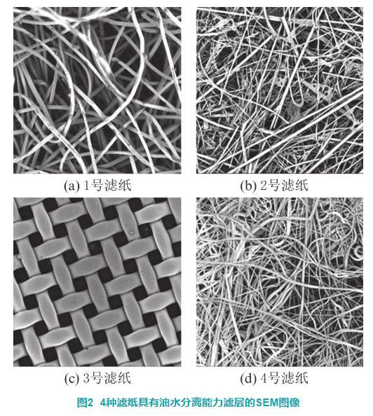 使用Phonem Pro X掃描電子顯微鏡(scanning electron microscope,SEM)在500倍放大倍率下拍攝的4種濾紙的微觀結(jié)構(gòu)如圖2所示。1號(hào)濾紙由直徑約為15μm的親水纖維構(gòu)成;2號(hào)濾紙的親水層由粗細(xì)不同的纖維通過(guò)樹(shù)脂粘接而成,其中粗纖維還起到增加親水層物理強(qiáng)度的作用;3號(hào)濾紙由直徑約為45μm的聚四氟乙烯纖維絲編制,兩根纖維之間的距離約為44μm;4號(hào)濾紙的b層由疏水材料通過(guò)熔噴工藝制成,在平面上纖維分布疏密不均但在空間內(nèi)有著較好的孔隙分布。除了3號(hào)濾紙外,其余濾紙均具有油水分離層,同時(shí)也具有較為復(fù)雜的空間結(jié)構(gòu)。