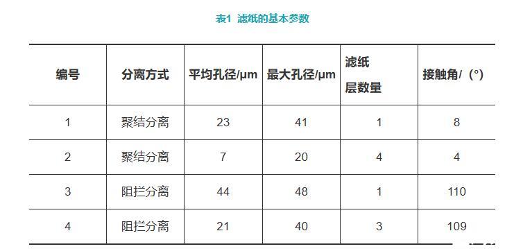 本試驗(yàn)選擇4種具有代表性結(jié)構(gòu)的濾紙,測(cè)量其在不同振動(dòng)條件下的油水分離效率,研究其變化規(guī)律,濾紙的基本參數(shù)如表1所示。1號(hào)和2號(hào)為聚結(jié)式濾紙,3號(hào)和4號(hào)為阻攔式濾紙。