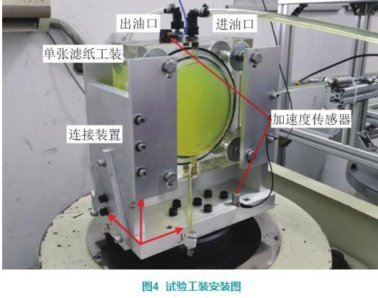 單張濾紙工裝由兩塊50 mm厚的有機(jī)玻璃制成,在頂部加工進(jìn)出油口,在底部加工放水口。單張濾紙工裝和振動(dòng)試驗(yàn)臺(tái)通過(guò)一個(gè)特制的鋁質(zhì)底座進(jìn)行連接,如圖4所示。