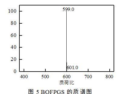 圖5為BOFPGS的質(zhì)譜圖表征,數(shù)據(jù)如下:MS(API):C13H11O3F16SO3-[M-H]-的質(zhì)荷比理論值為599.00,實測值為599.0。