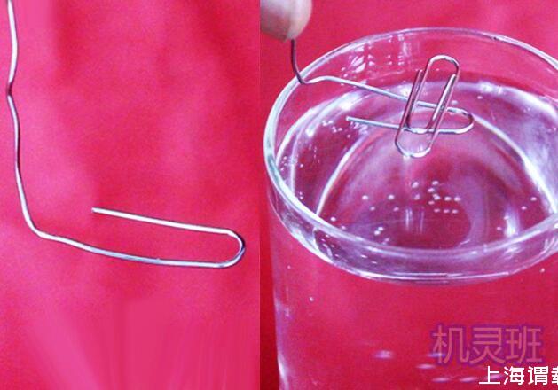 3、現在,將步驟2的整體回形針水平地慢慢地貼近水面,再輕輕抽走作為支架的回形針,則你會發現回形針漂浮在水面上。