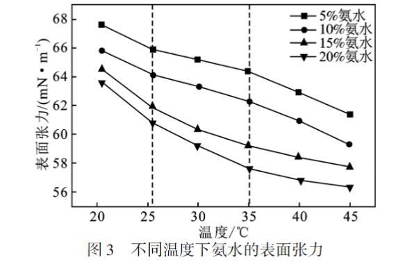 (2)隨著溫度升高,不同濃度下的氨水表面張力值均呈下降趨勢,且下降過程可分為3個階段。溫度小于35℃時,各濃度下前兩階段下降趨勢相似,降幅先大后小;35~45℃范圍,5%和10%的氨水表面張力值降幅增加,而15%和20%的氨水表面張力值降幅減小,并趨于穩(wěn)定。