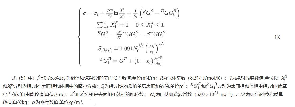 式(5)中:=0.75,σ和σi為溶體和純組分i的表面張力數(shù)值,單位mN/m;R為氣體常數(shù)(8.314 J/mol/K);T為絕對溫度數(shù)值,單位K;XiS和XiB分別為組分i在表面相和體相中的摩爾分數(shù);Si為組分i純物質(zhì)的單層表面積數(shù)值,單位m2;分別為表面相和體相中組分i的偏摩爾吉布斯自由能數(shù)值,單位J/mol;ZS和ZB分別是表面相和體相的配位數(shù);No為阿伏伽德羅常數(shù)(6.02×1023 mol-1);Mi為組分i的摩爾質(zhì)量數(shù)值,單位kg;ρi為密度數(shù)值,單位kg/m3。