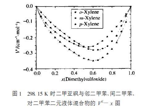 從圖1 可以看出,在298.15 K 時(shí),二甲亞砜+鄰二甲苯、二甲亞砜+間二甲苯、二甲亞砜+對(duì)二甲苯共3 個(gè)二元混合物在全濃度范圍內(nèi)過(guò)量體積為負(fù)值,在最小值處大小順序?yàn)?鄰二甲苯>間二甲苯>對(duì)二甲苯。二甲亞砜是極性分子,存在 SO基團(tuán),是電子的受體;二甲苯分子中存在著大 π鍵,是電子授體,電子受體與電子授體之間形成 n -π配鍵,屬于弱化學(xué)作用,從而使他們組成的混合物體積收縮,過(guò)量體積呈現(xiàn)負(fù)偏差。