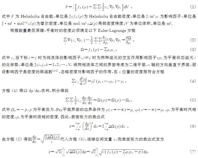 vanderWaals首先提出了密度梯度理論,并將該理論用于氣液界面,通過對氣液界面的研究得出結論,界面處的密度變化是連續的,后來該理論被Cahn和Hilliard完善。該理論中,界面的Helmholtz自由能密度為兩部分的加和:均相部分和非均相部分。Helmholtz自由能密度Taylor級數的二階展開式為