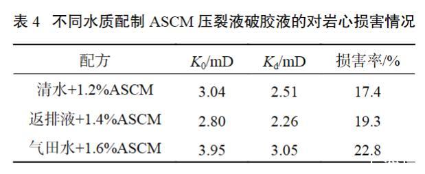 表4不同水質配制ASCM壓裂液破膠液的對巖心損害情況