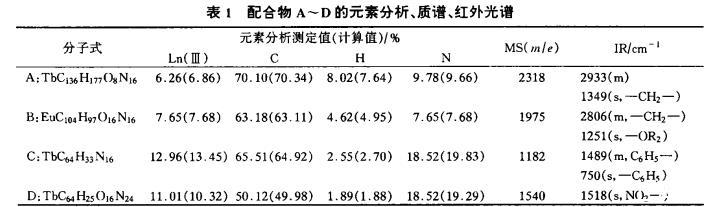 表1配合物A~D的元素分析、質譜、紅外光譜