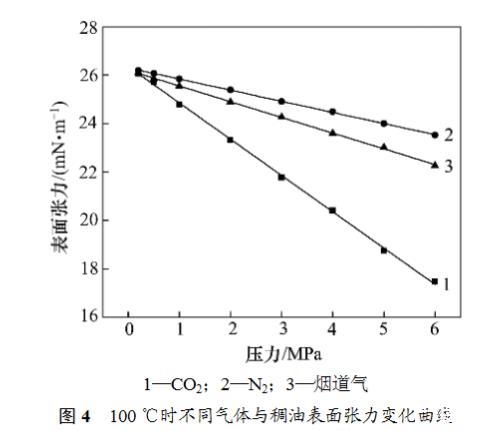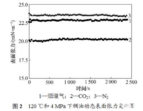 6)在一定的壓力和溫度條件下,每個(gè)煙道氣-稠油系統(tǒng)的表面張力測(cè)定重復(fù)3次,以保證較好的重復(fù)性。