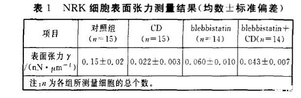 實(shí)驗中,分別單獨(dú)加入骨架蛋白抑制劑2μmol/L CD和30μmol/L blebbistatin,再同時加入2μmol/L CD和30μmol/L blebbistatin。各組細(xì)胞處理15~20 min后進(jìn)行細(xì)胞表面張力測量。利用公式(1)計算細(xì)胞表面張力,實(shí)驗結(jié)果見表1。