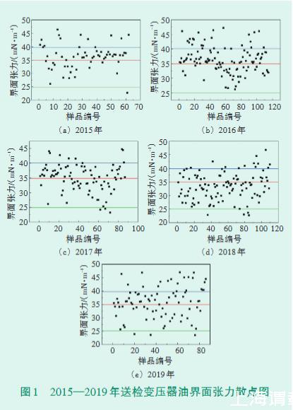 變壓器油油相與水相互不相容,兩者接觸時,其界面間產(chǎn)生的力即為界面張力。界面張力是反映變壓器油在精制過程中潔凈程度的指標(biāo),變壓器油在使用過程中會摻入雜質(zhì)并產(chǎn)生油質(zhì)老化現(xiàn)象,老化過程中會產(chǎn)生COOH-與OH-等親水的極性基團(tuán),而油分子本身為憎水的非極性基團(tuán),從而導(dǎo)致親水基團(tuán)向水相轉(zhuǎn)移,憎水基團(tuán)向油相轉(zhuǎn)移,兩者在水相與油相之間產(chǎn)生垂直于界面的力,導(dǎo)致油與水之間的界面張力減小。所以,變壓器油的界面張力與油品老化程度密切相關(guān)。本文統(tǒng)計了2015—2019年內(nèi)蒙古西部地區(qū)入網(wǎng)變壓器油界面張力數(shù)據(jù),分析了每年的不合格率及其原因,為入網(wǎng)變壓器油界面張力檢測提供參考。
