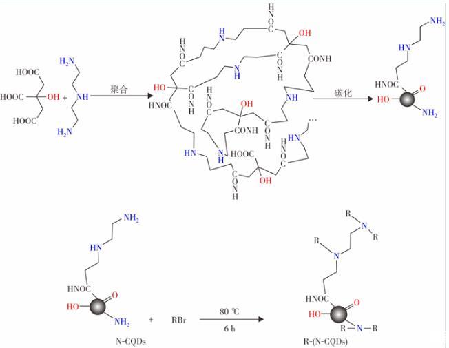 方法 在水熱條件下,以檸檬酸作為碳源、二乙烯三胺為氮源合成了碳量子點(CQDs)和氮摻雜碳量子點(N-CQDs);通過烷基化反應對制備出的N-CQDs進行表面改性,得到一種兩親性表面活性物質R-(N-CQDs)。