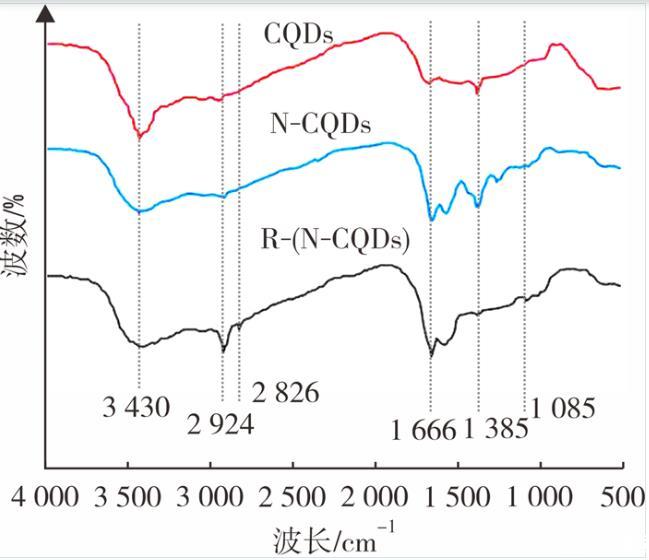 圖2是CQDs、N-CQDs與R-(N-CQDs)的紅外吸收光譜,在3 430 cm-1處的吸收峰是O-H和N-H伸縮振動,相比于N-CQDs,R-(N-CQDs)在此處的吸收峰較弱,說明在N-CQDs基礎上發生了一定程度的烷基化反應,而CQDs在此處的峰比N-CQDs與R-(N-CQDs)的峰要窄,因為CQDs上只存在O-H的伸縮振動,在2 924 cm-1和2 824 cm-1處的吸收峰是C-H的伸縮振動,R-(N-CQDs)在此處的吸收峰比N-CQDs的要強。1 660 cm-1處的吸收峰對應于酰胺基團C=O鍵的拉伸振動,1 385 cm-1處的峰為C-O伸縮振動,1 085 cm-1處的峰為胺類烷基的C-N振動,R-(N-CQDs)在此處的峰較N-CQDs更為明顯,而CQDs在此處看不到任何吸收峰,進一步說明在R-(N-CQDs)在N-CQDs的基礎上完成烷基化改性成功引入碳長鏈。圖2表明實現了將氮原子摻雜到碳量子點中的目標,并且在此基礎上引入了碳長鏈對其進行表面修飾。