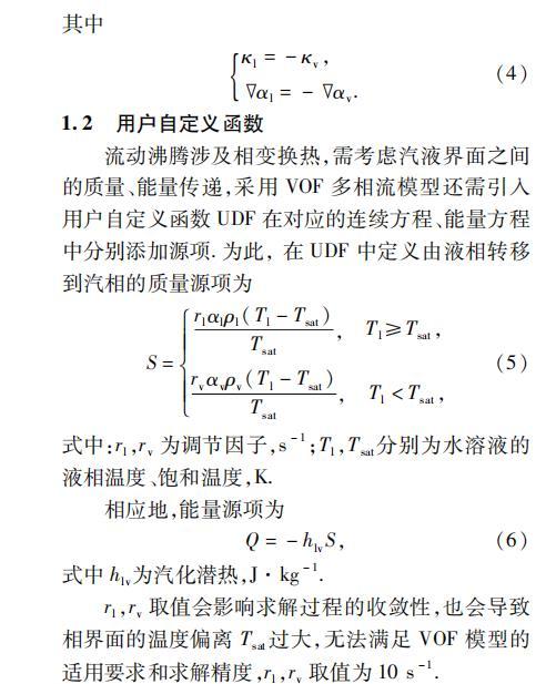流動(dòng)沸騰涉及相變換熱,需考慮汽液界面之間的質(zhì)量、能量傳遞,采用VOF多相流模型還需引入用戶自定義函數(shù)UDF在對應(yīng)的連續(xù)方程、能量方程中分別添加源項(xiàng)。為此,在UDF中定義由液相轉(zhuǎn)移到汽相的質(zhì)量源項(xiàng)為