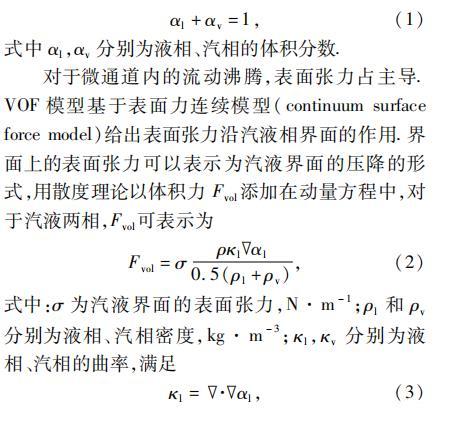 對于微通道內(nèi)的流動(dòng)沸騰,表面張力占主導(dǎo)。VOF模型基于表面力連續(xù)模型(continuum surface force model)給出表面張力沿汽液相界面的作用。界面上的表面張力可以表示為汽液界面的壓降的形式,用散度理論以體積力Fvol添加在動(dòng)量方程中,對于汽液兩相,F(xiàn)vol可表示為