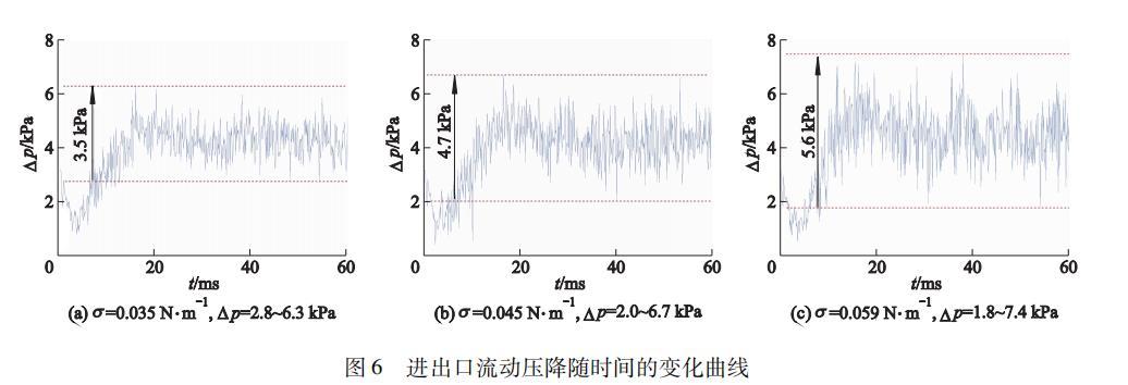 通道進出口汽液兩相的總體壓降Δp常作為衡量流動是否穩定的標準。σ分別為0.035,0.045,0.059 N·m?1時,通道進出口壓降Δp隨時間的變化曲線如圖6所示。20 ms之后,微通道內的汽液兩相流進入相對穩定的充分發展狀態,在20~60 ms的時間間隔內,3種表面張力對應的Δp的波動范圍分別為2.8~6.3,2.0~6.7,1.8~7.4 kPa。σ=0.035 N·m?1時,Δp波動幅度最小,與σ=0.059 N·m?1相比,Δp波幅減小約2.1 kPa。可以認為,減小表面張力σ,汽液兩相的壓降波動幅度減小,汽液兩相流的流動穩定性提高。
