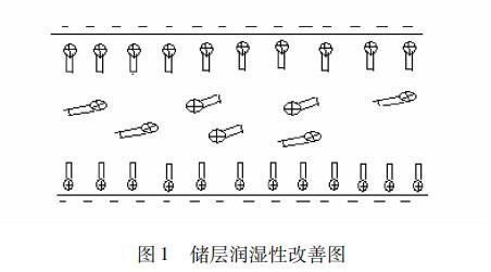 砂巖的主要成分是硅酸鹽,其表面帶有負電荷,親水能力很強,當帶有親水正電荷的表面活性劑與其接觸時,使巖石變為親油,當表面活性劑濃度較大時,又重新吸附到巖石表面,再次使巖石變為親水。陽離子表面活性劑通過正電荷與砂巖表面相互作用,形成親油端朝外的疏水吸附層,使得進入孔隙的壓裂液聚集并脫離巖石表面,起到提高返排率的作用(圖1)。