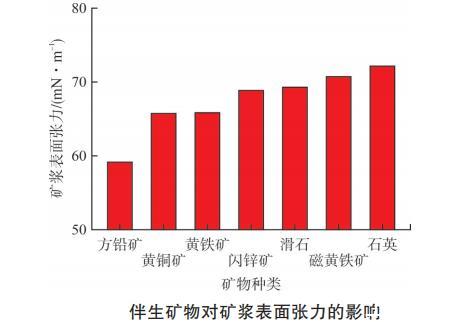 對礦漿濃度為 30%的黃銅礦、方鉛礦、滑石、閃鋅礦及石英的礦漿表面張力進(jìn)行了測定。在 pH=7、粒度-0.074 mm占比 80%的條件下,考察了黃鐵礦與磁黃鐵礦及伴生礦物質(zhì)量比為 7∶3時,不同伴生礦物對礦漿表面張力的影響,。結(jié)果發(fā)現(xiàn):不同礦物的礦漿表面張力存在差異,具體為石英 72.17 mN/m、磁黃鐵礦 70.72 mN/m、滑石 69.31 mN/m、閃鋅礦 68.88 mN/m、黃鐵礦 65.89 mN/m、黃銅礦 65.72 mN/m、方鉛礦 59.14 mN/m。分析結(jié)果表明,方鉛礦的礦漿表面張力最低,而石英的礦漿表面張力與水的表面張力(72.80 mN/m)最為接近。